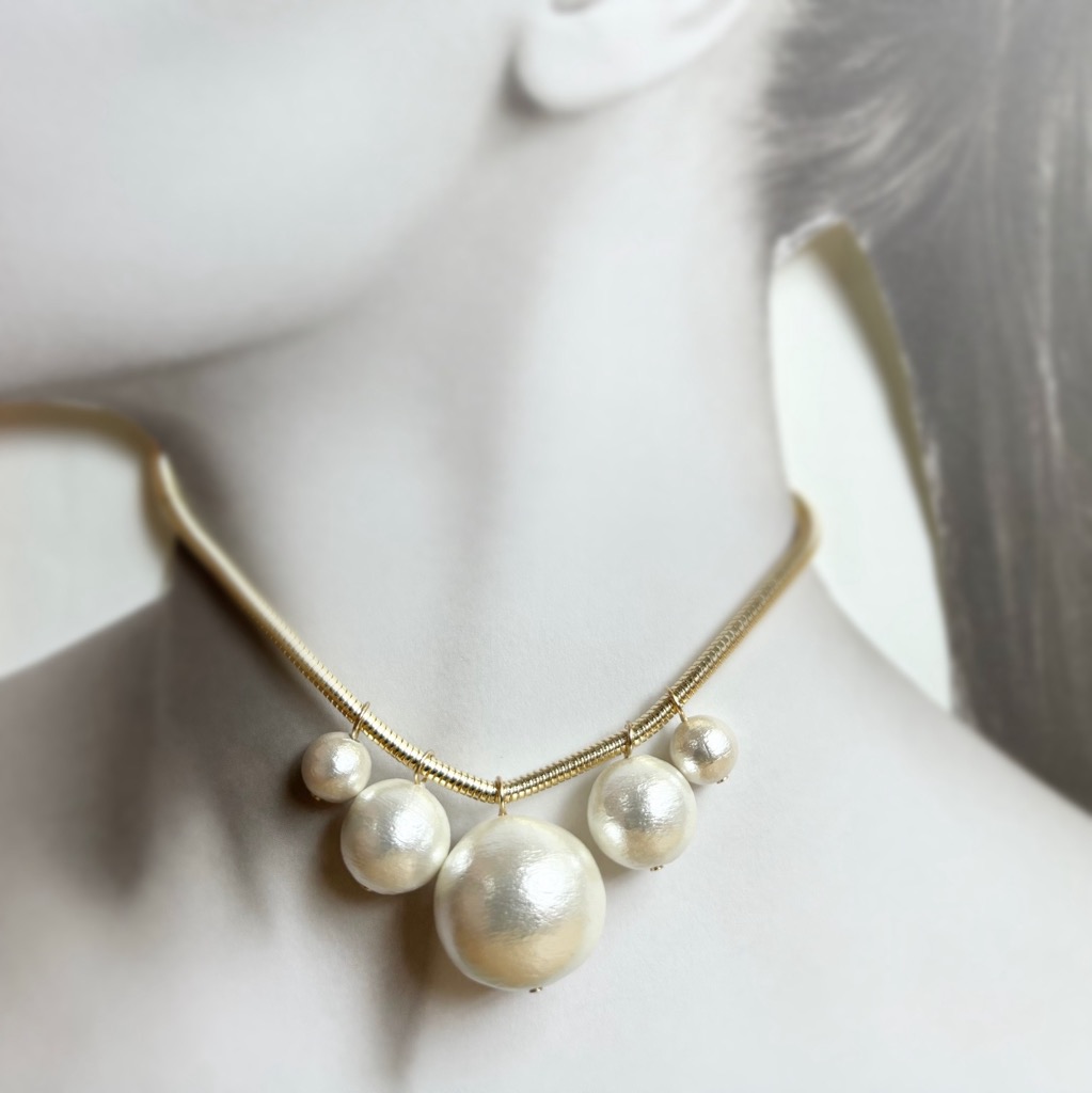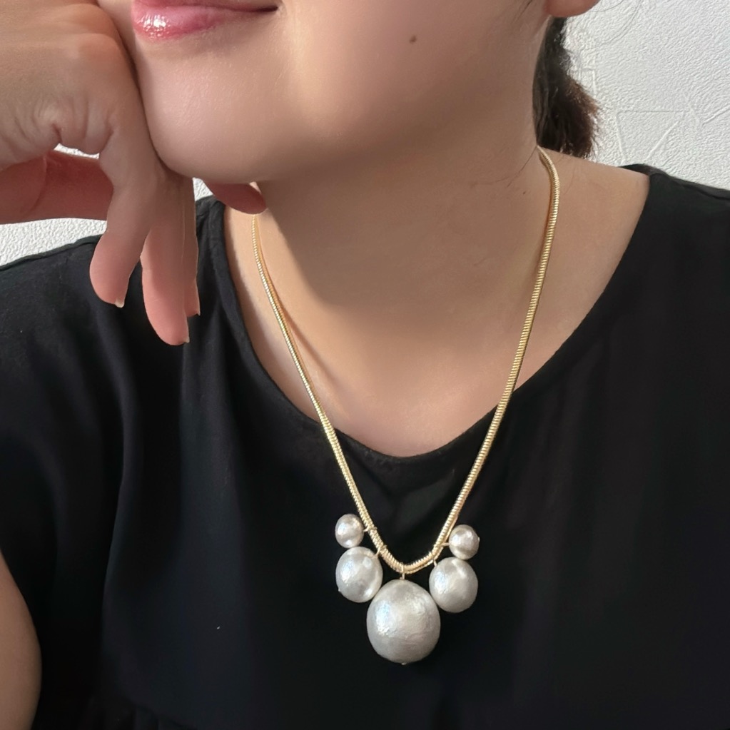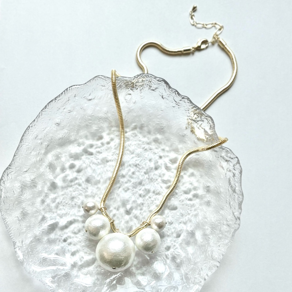 大ぶりのコットンパールたちを印象的なスネークチェーンに並べた